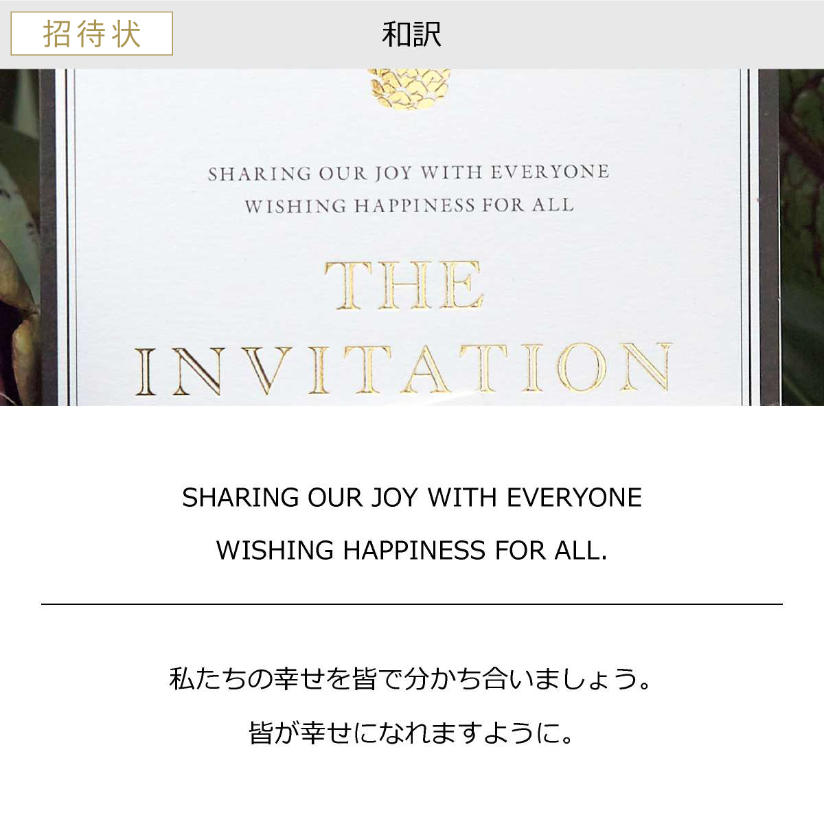 ハワイらしい招待状を探していて金色を使っていることもありゴージャスでした。 印刷込みだったので、届きしだいすぐに完成しました。 私のミスなのですが、入力の際に"様"が抜けており、封筒に様が記入されていない物が何通か… 様だけ手書きになってしまい、残念でした。 こちらのミスでありますが、連絡をくれると良かったかなーと思います。 でもとても気に入っています!